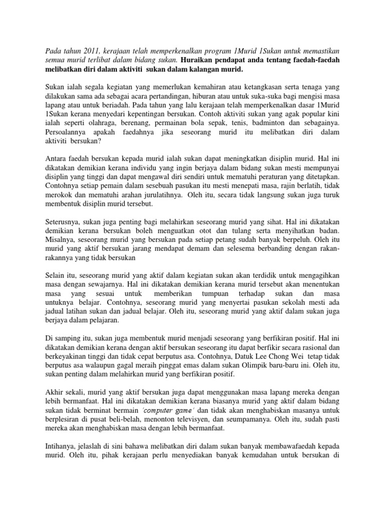 Faedah-faedah melibatkan diri dalam aktiviti sukan Pada tahun 2011 kerajaan telah memperkenalkan program 1Murid 1Sukan untuk memastikan semua murid terlibat dalam bidang sukan. Pada tahun 2011 kerajaan telah memperkenalkanprogram 1Murid 1Sukan untuk memastikan semua murid terlibat dalam bidang sukan. Huraikan pendapat anda tentang faedah-faedah melibatkan diri dalam aktiviti sukan.